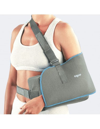 Struttura cuscino in gommaschiuma ad alta densità, rivestimento di tutti gli elementi del tutore in tessuto accoppiato con nylon garzato, reggibraccio per immobilizzazione del braccio, tiranti per applicazione tutore e reggibraccio con chiusure a velcro, coppia di bracciali per la rieducazione dinamica dell'avambraccio/braccio.