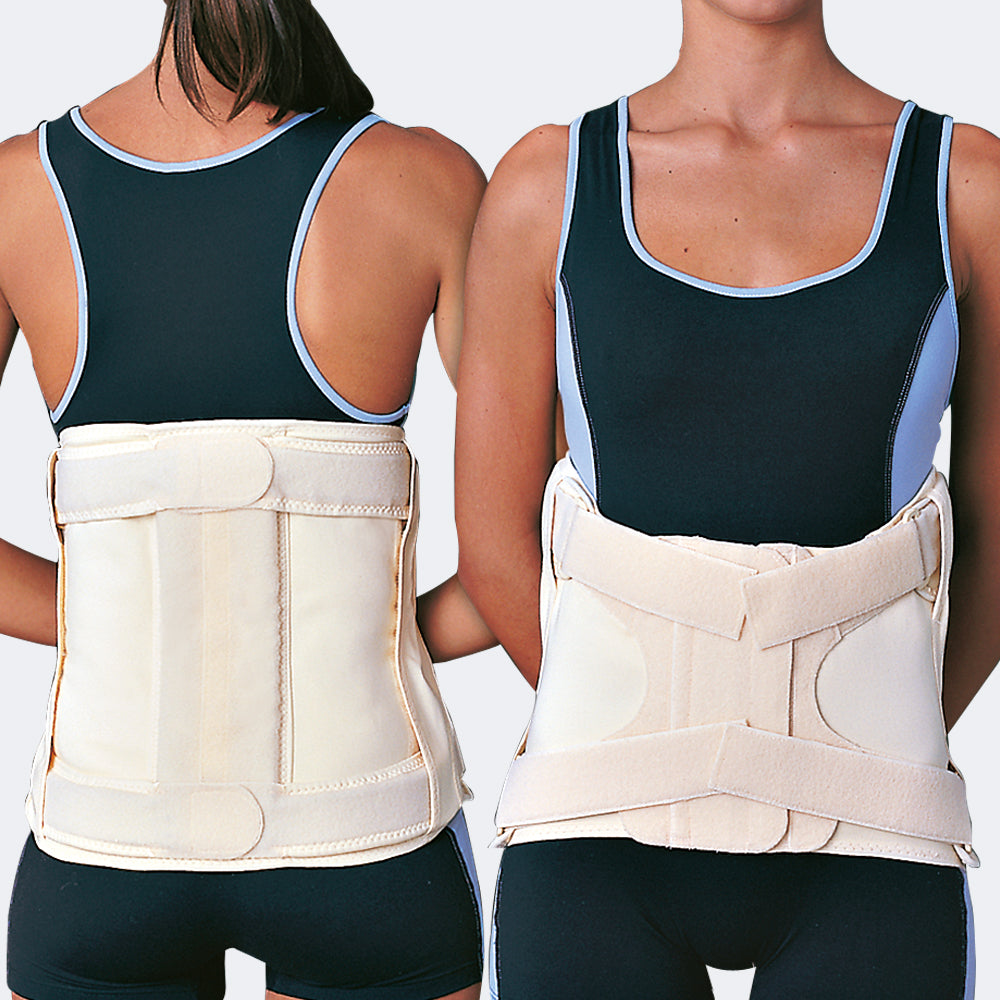 Busto rigido lombosacrale a struttura metallica imbottita e rivestita in tessuto.