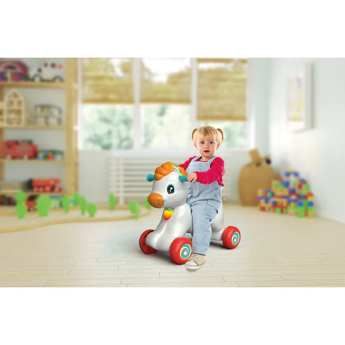 Un dolce cavallino 3 in 1 che è dondolo, cavalcabile e centro attività interattivo!