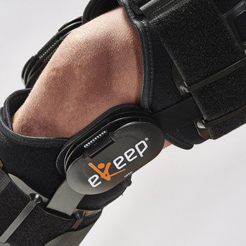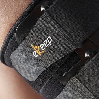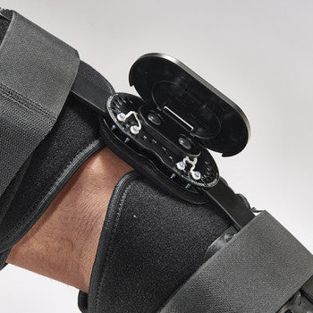 Tutore dotato di due stecche laterali con sistema dinamico a molla anti-iperestensione del ginocchio.