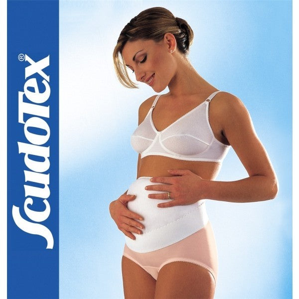 Fascia gestante Cotton Mater Scudotex, dotata di soffice ed igienico davantino in maglina di cotone che si estende armoniosamente con l’evolversi della gravidanza e di funzionale fascia regolabile dorsale ed addominale che sostiene e protegge il ventre materno.