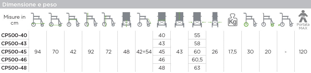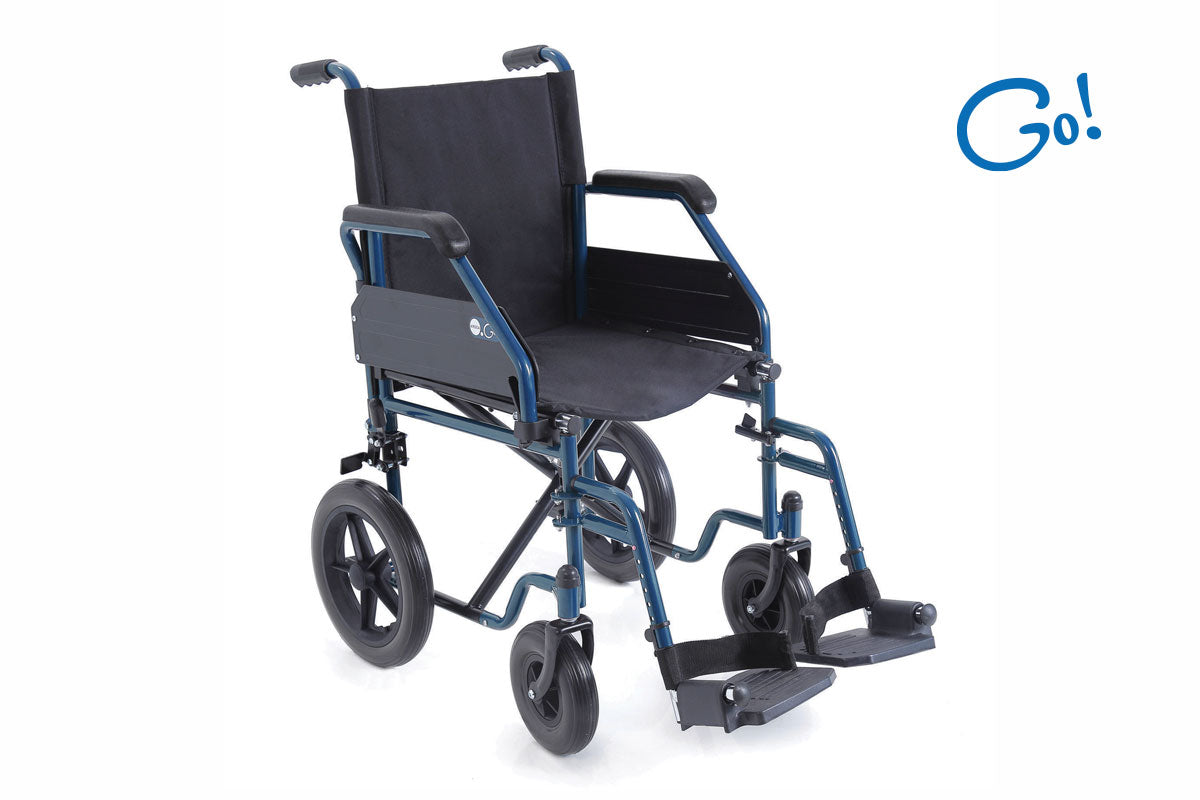 Telaio stabilizzante in acciaio verniciato crociera singola, seduta e schienale in nylon nero imbottito e lavabile, tasca portadocumenti sul retro. Ruote posteriori (Ø 30 cm), gomme nere in PU. Ruote anteriori nere in PU (Ø 20 cm – spessore 3 cm) con forcella in acciaio. Braccioli corti ribaltabili con imbottitura in PU. Pedane estraibili regolabili in lunghezza con pedana in plastica nera e cinturino ferma-tallone.