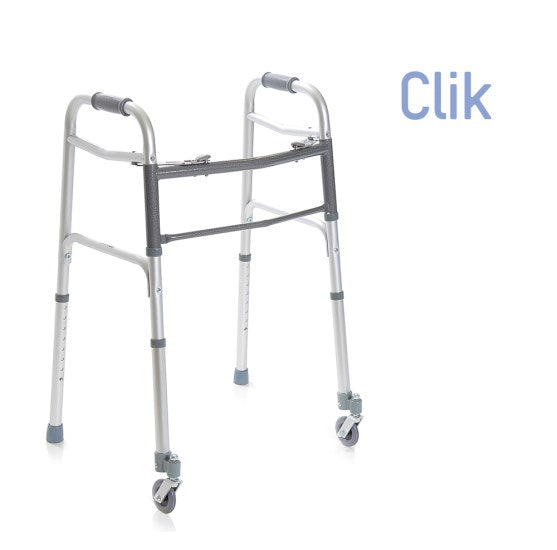 Deambulatore pieghevole costruito in alluminio anodizzato con manopole imbottite. Dotato di due ruote piroettanti frontali e due gambe posteriori, puntali in gomma antiscivolo. Ciascun lato della struttura si chiude separatamente.