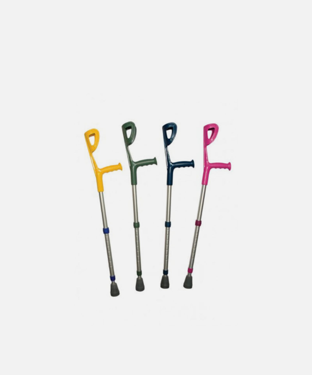 Coppia di Stampelle leggere pediatriche costruite in tubo di alluminio anodizzato. Impugnatura anatomica antiscivolo stampata ad iniezione e composta da unico pezzo per offrire comfort e sicurezza.